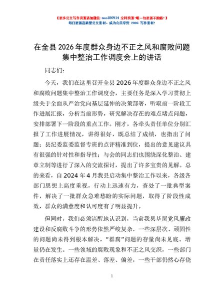 / 在全县2026年度群众身边不正之风和腐败问题集中整治工作调度会上的讲话