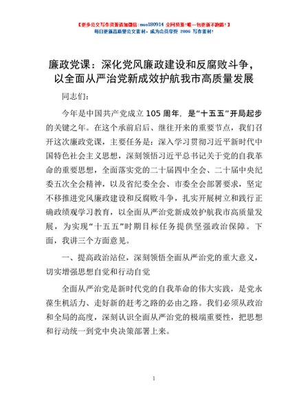 / 廉政党课:深化党风廉政建设和反腐败斗争,以全面从严治党新成效护航我市高质量发展
