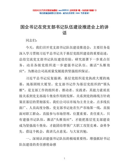 / 国企书记在党支部书记队伍建设推进会上的讲话
