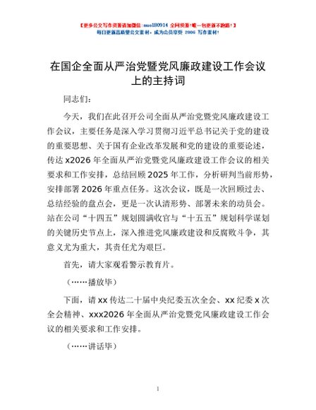 / 在国企全面从严治党暨党风廉政建设工作会议上的主持词