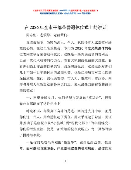 / 在2026年全市干部荣誉退休仪式上的讲话