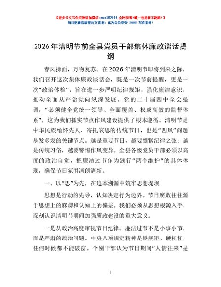 / 2026年清明节前全县党员干部集体廉政谈话提纲