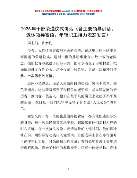 / 2026年干部荣退仪式讲话(含主要领导讲话、退休领导寄语、年轻职工接力表态发言)