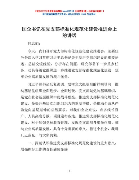 / 国企书记在党支部标准化规范化建设推进会上的讲话