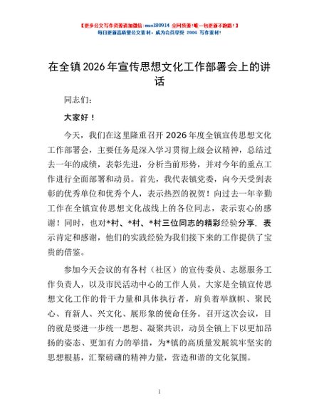 / 在全镇2026年宣传思想文化工作部署会上的讲话