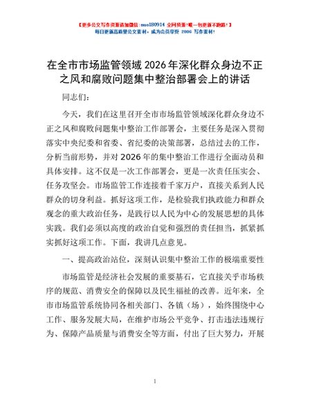 / 在全市市场监管领域2026年深化群众身边不正之风和腐败问题集中整治部署会上的讲话