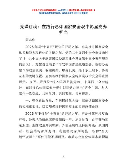 / 党课讲稿:在践行总体国家安全观中彰显党办担当
