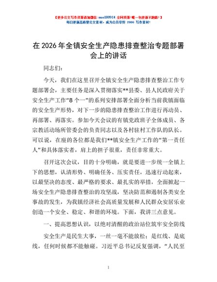 / 在2026年全镇安全生产隐患排查整治专题部署会上的讲话