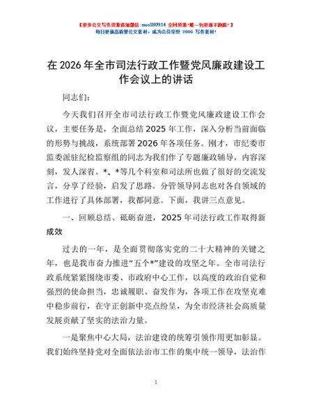 / 在2026年全市司法行政工作暨党风廉政建设工作会议上的讲话