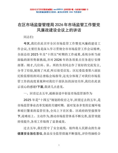 / 在区市场监督管理局2026年市场监管工作暨党风廉政建设会议上的讲话
