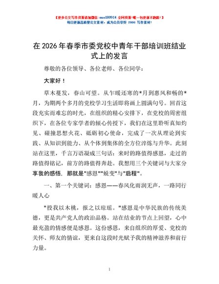 / 在2026年春季市委党校中青年干部培训班结业式上的发言