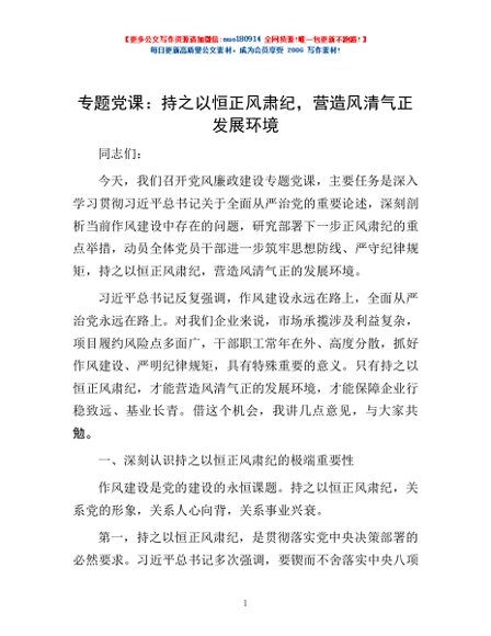 / 专题党课:持之以恒正风肃纪,营造风清气正发展环境