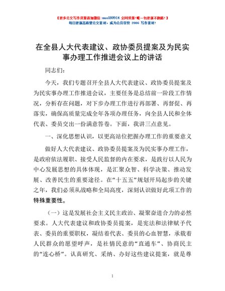 / 在全县人大代表建议、政协委员提案及为民实事办理工作推进会议上的讲话