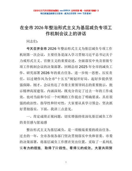 / 在全市2026年整治形式主义为基层减负专项工作机制会议上的讲话