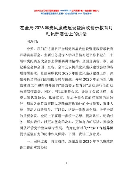 / 在全局2026年党风廉政建设暨廉政警示教育月动员部署会上的讲话