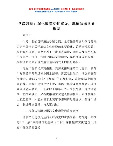 / 党课讲稿:深化廉洁文化建设,厚植清廉国企根基