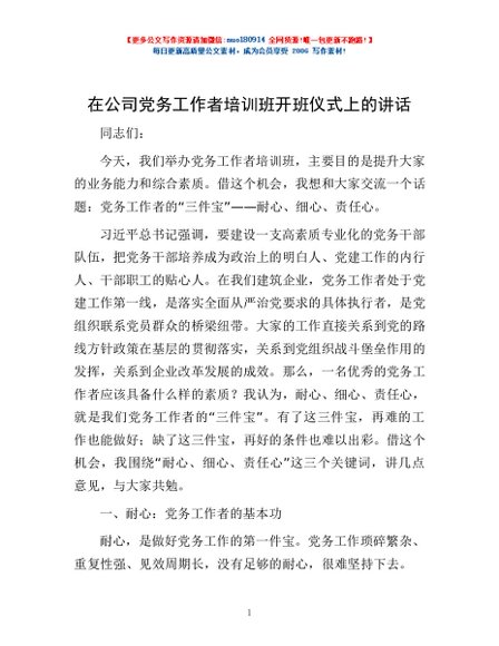 / 在公司党务工作者培训班开班仪式上的讲话