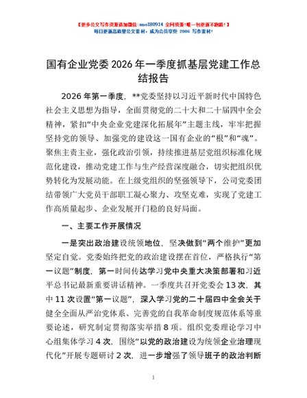 / 国有企业党委2026年一季度抓基层党建工作总结报告