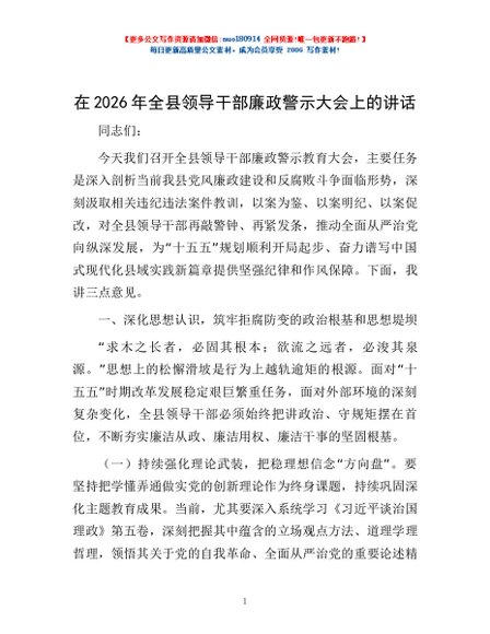/ 在2026年全县领导干部廉政警示大会上的讲话