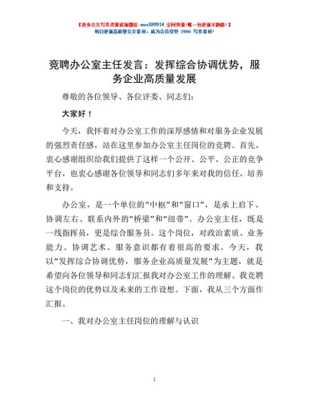 / 竞聘办公室主任发言:发挥综合协调优势,服务企业高质量发展