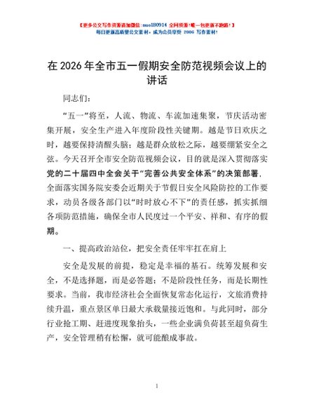 / 在2026年全市五一假期安全防范视频会议上的讲话