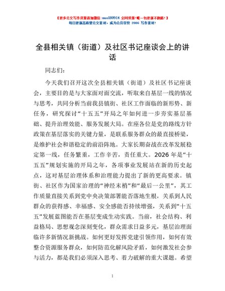 / 全县相关镇(街道)及社区书记座谈会上的讲话
