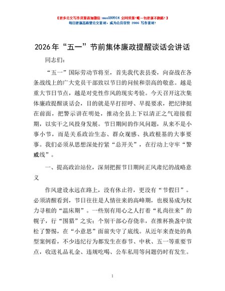 / 2026年“五一”节前集体廉政提醒谈话会讲话