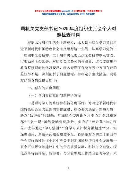 / 局机关党支部书记2025年度组织生活会个人对照检查材料