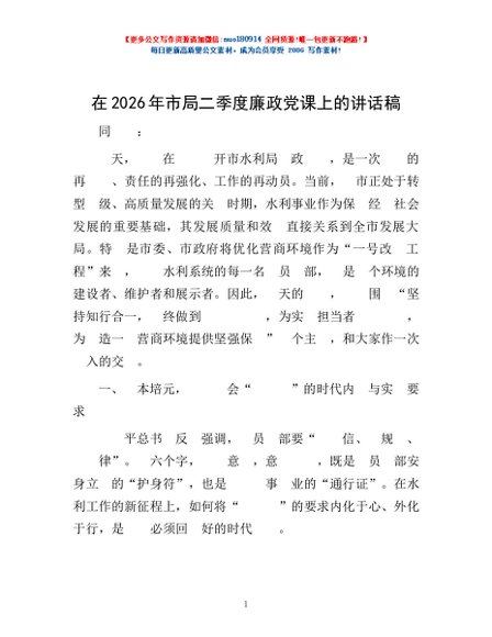 / 在2026年市局二季度廉政党课上的讲话稿
