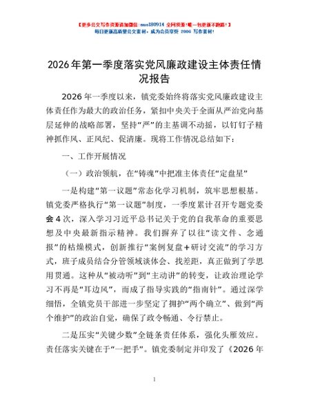 / 2026年第一季度落实党风廉政建设主体责任情况报告