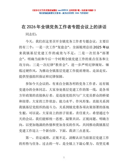 / 在2026年全镇党务工作者专题会议上的讲话
