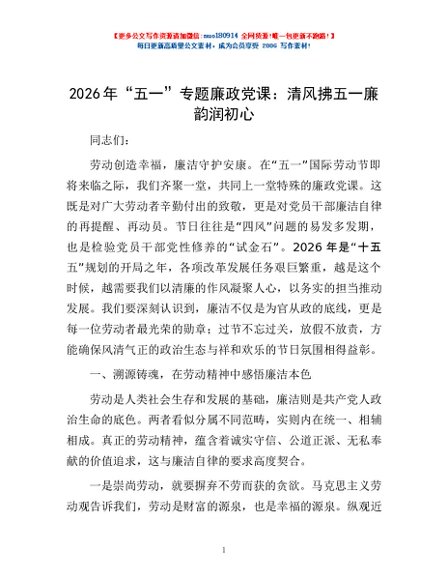 2026 年“五一”专题廉政党课:清风拂五一 廉韵润初心