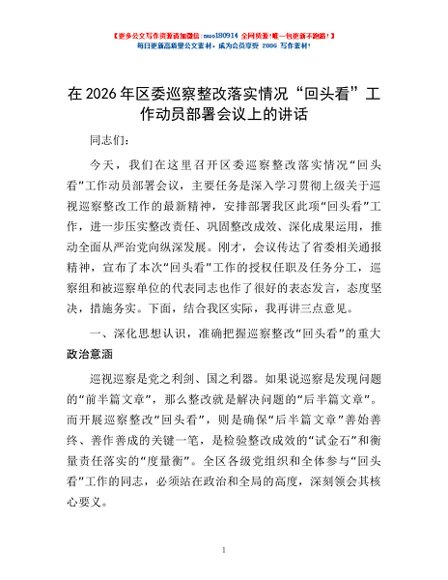 / 在2026年区委巡察整改落实情况“回头看”工作动员部署会议上的讲话