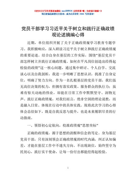 / 党员干部学习习近平关于树立和践行正确政绩观论述摘编心得