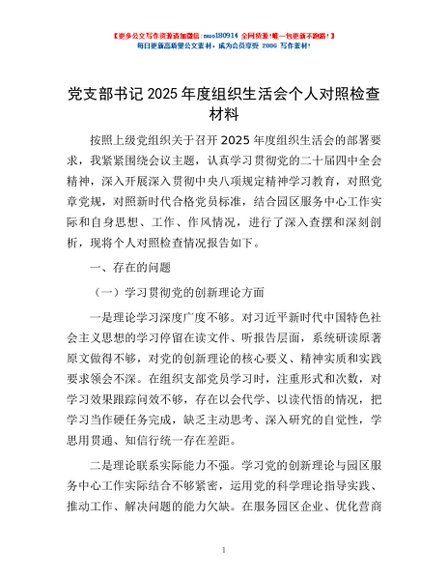 / 党支部书记2025年度组织生活会个人对照检查材料