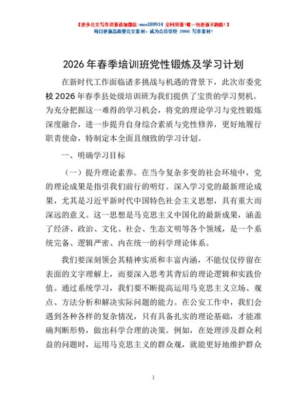 / 2026年春季培训班党性锻炼及学习计划