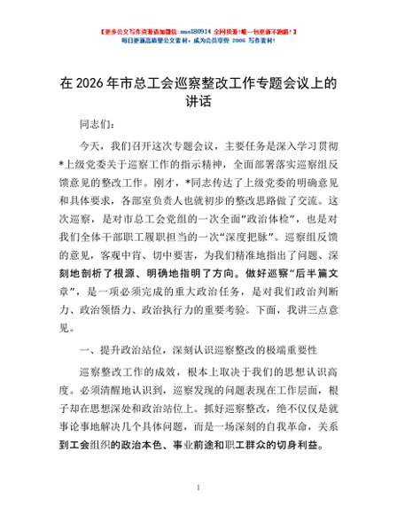 / 在2026年市总工会巡察整改工作专题会议上的讲话