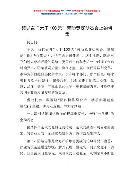 / 领导在“大干100天”劳动竞赛动员会上的讲话
