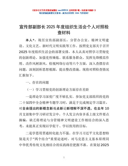 / 宣传部副部长2025年度组织生活会个人对照检查材料