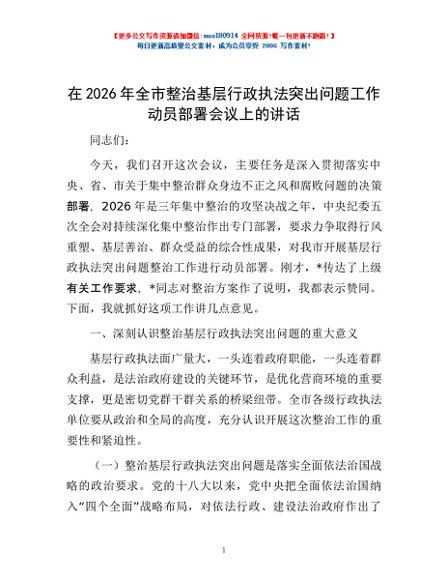 / 在2026年全市整治基层行政执法突出问题工作动员部署会议上的讲话
