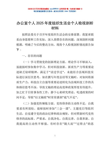 / 办公室个人2025年度组织生活会个人检视剖析材料
