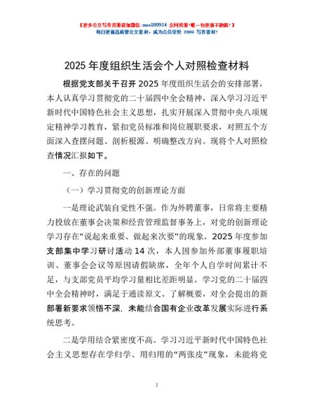 / 2025年度组织生活会个人对照检查材料