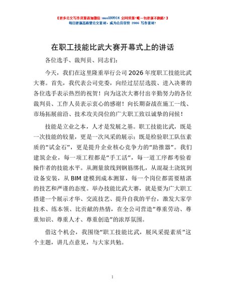 / 在职工技能比武大赛开幕式上的讲话