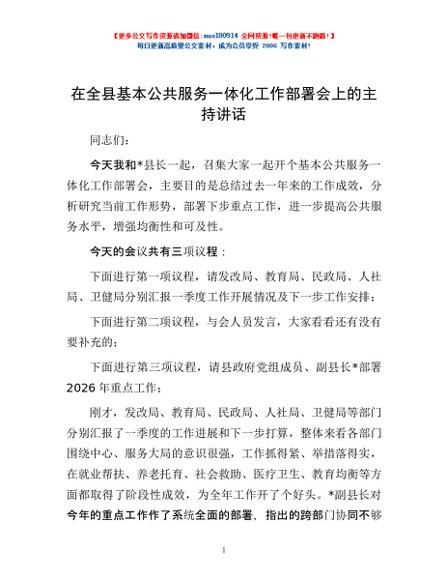 / 在全县基本公共服务一体化工作部署会上的主持讲话