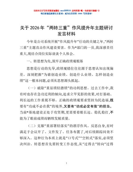 / 关于2026年“两转三重”作风提升年主题研讨发言材料