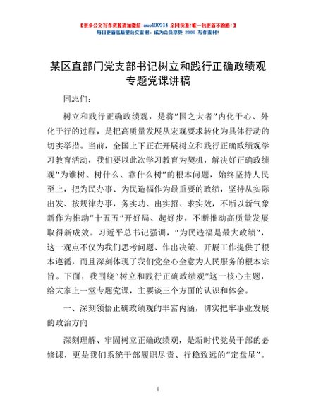 / 某区直部门党支部书记树立和践行正确政绩观专题党课讲稿