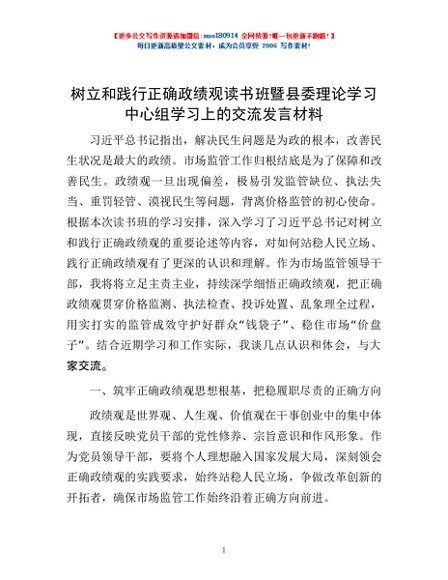 / 树立和践行正确政绩观读书班暨县委理论学习中心组学习上的交流发言材料