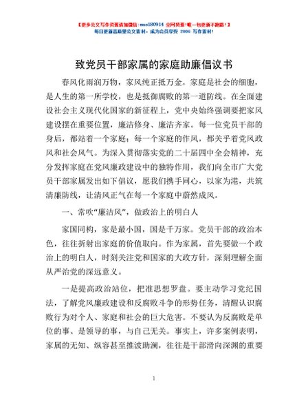 / 致党员干部家属的家庭助廉倡议书