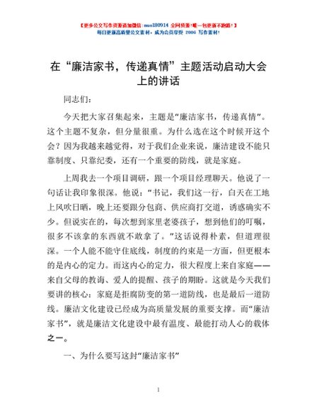 / 在“廉洁家书,传递真情”主题活动启动大会上的讲话