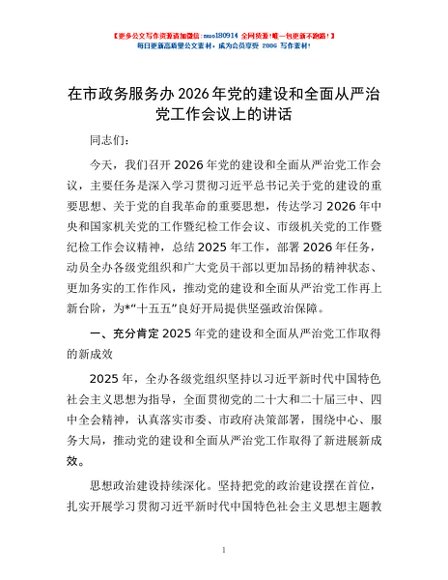 / 在市政务服务办2026年党的建设和全面从严治党工作会议上的讲话